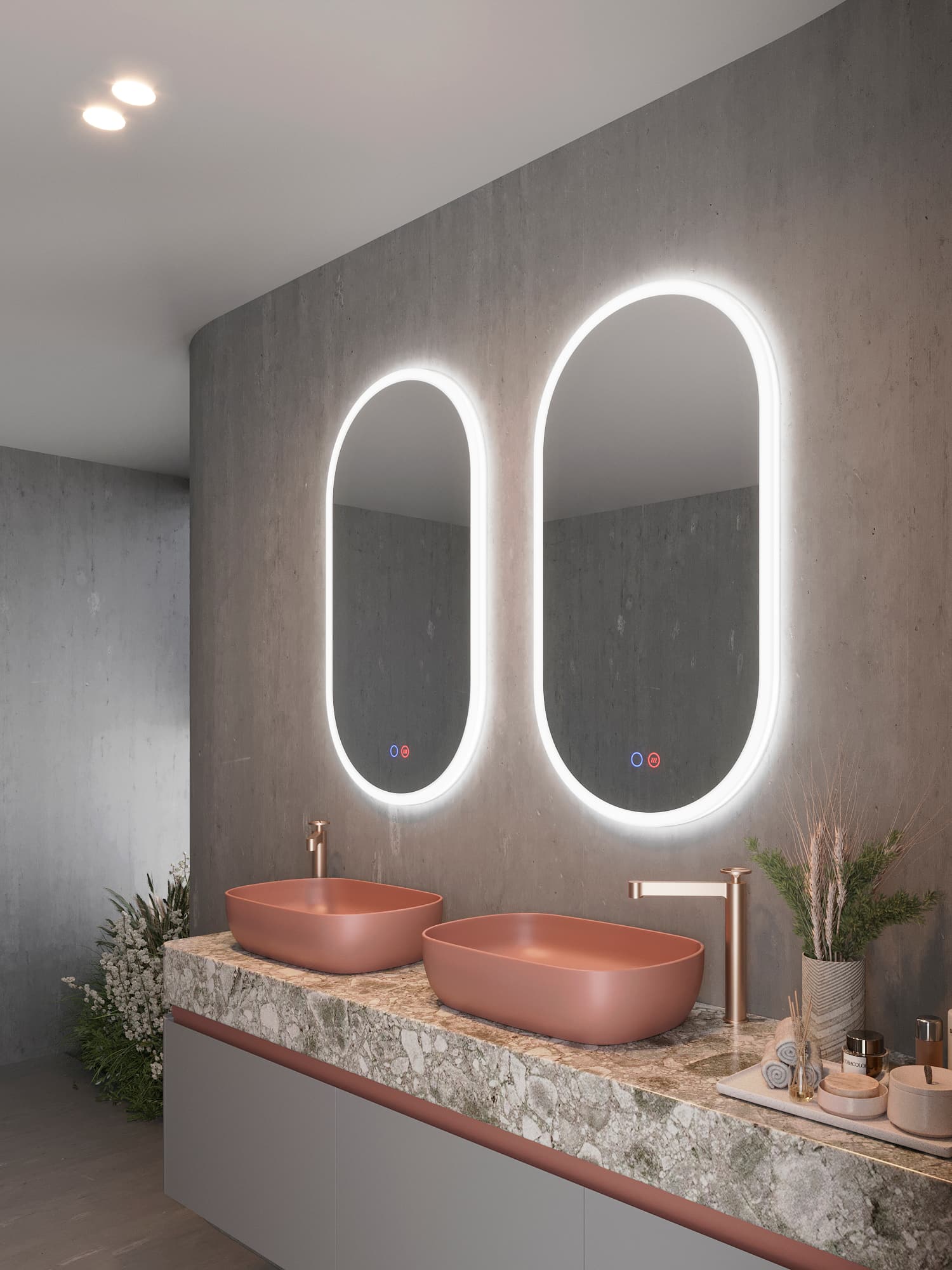 Espejo elíptico con marco totalmente iluminado que aporta una mayor cantidad de luz, perfecto para baños con poca luminosidad. Doble sensor on/off y antivaho. Solo en luz fría.