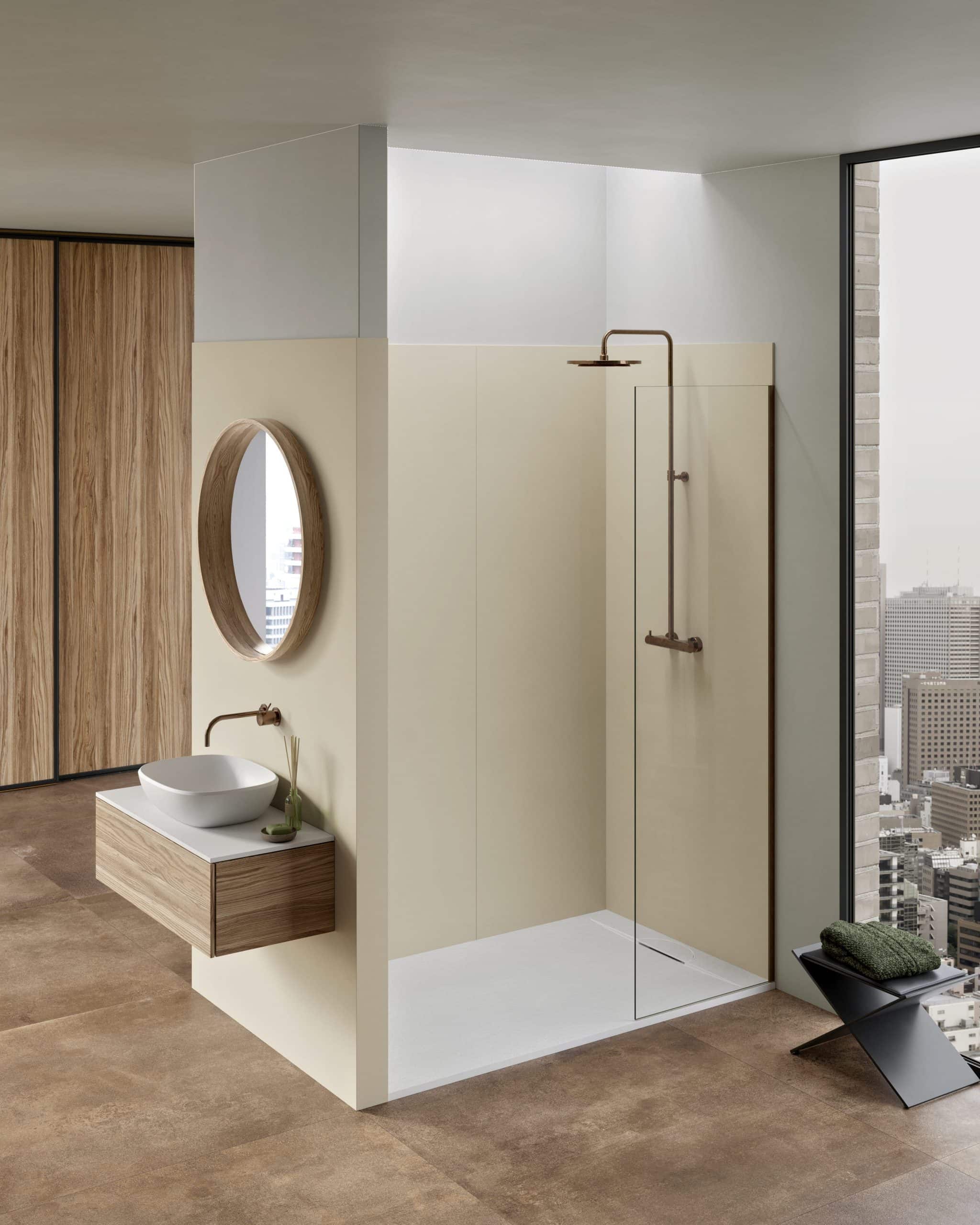 Destaca por su diseño sofisticado y su tapa alargada, que evoca el horizonte y oculta una discreta válvula de desagüe lineal. Textura pizarra, antideslizante.